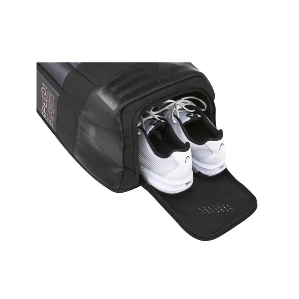 Avec son nouveau look noir et gris et son design moderne, le sac à dos Head Djokovic se marie à la perfection avec les nouvelles raquettes Speed. En effet, ses bords arrondis lui offrent un aspect haut de gamme qui fait écho à la qualité des finitions du sac. En plus d’être élégant, il permet de transporter une à deux raquettes dans son compartiment rembourré. La large poche principale vous permettra de ranger toutes vos affaires facilement. De plus, vous retrouverez également sous le sac un compartiment pour chaussures aéré. Puis d’autres petits rangements vous permettront de ranger vos accessoires, et vos effets personnels.